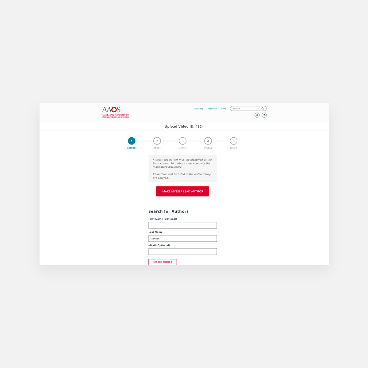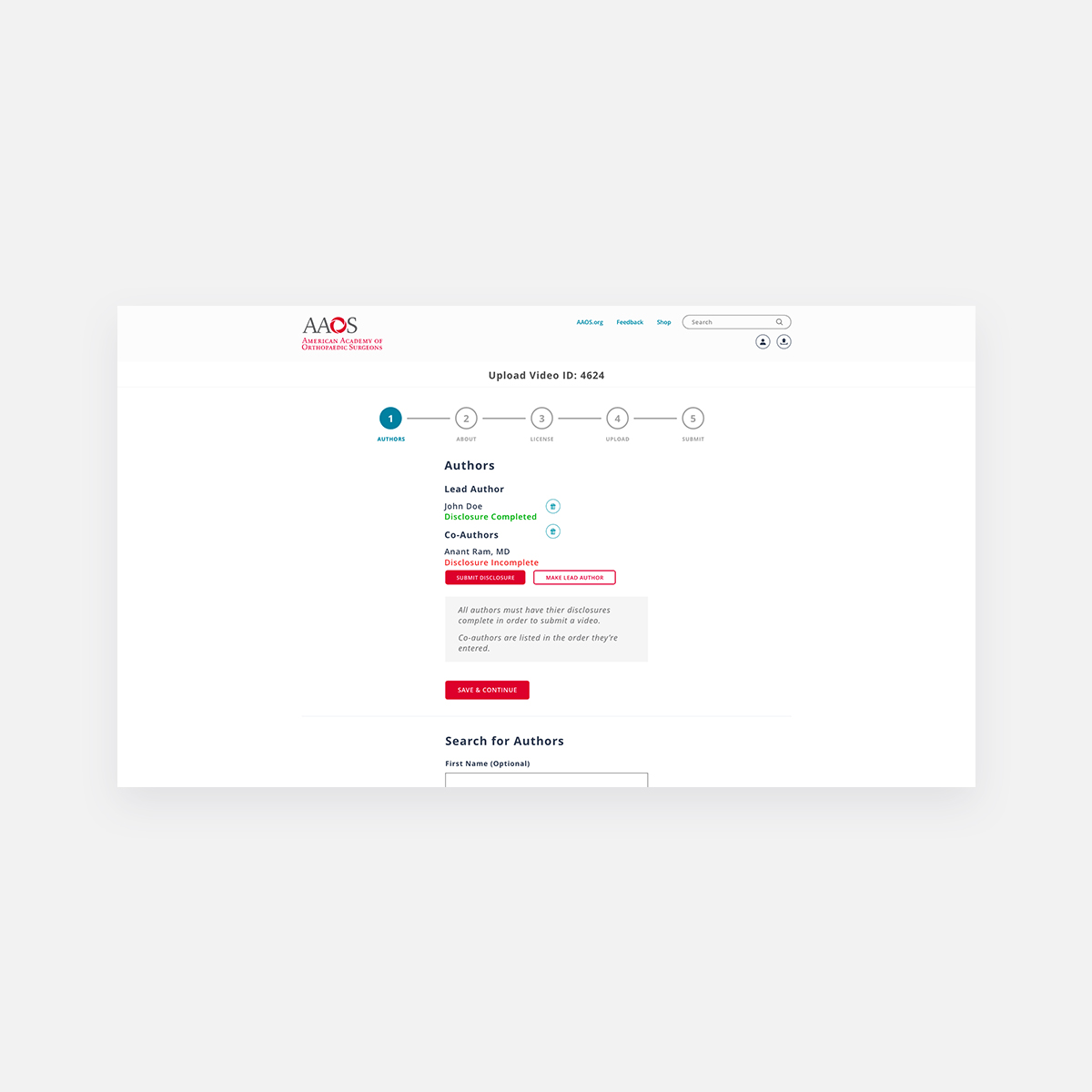The initial step involved adding co-authors to videos, requiring users to search and add each one individually. To streamline this, I designed a modal window displaying search results, eliminating the need for users to navigate back and forth. A critical point identified through user testing was the confusion around selecting a lead author (who had completed their annual disclosure). We addressed this by visually indicating each co-author’s disclosure status with red and green colors, accompanied by clear messaging below their names. If disclosure was incomplete, a call-to-action button prompted users to take necessary action.