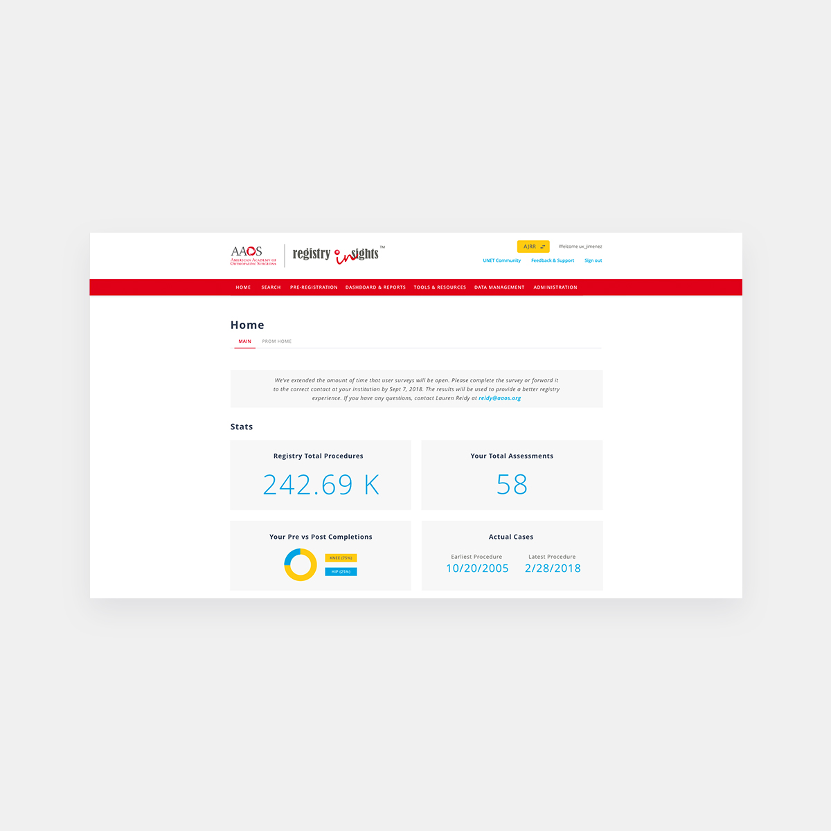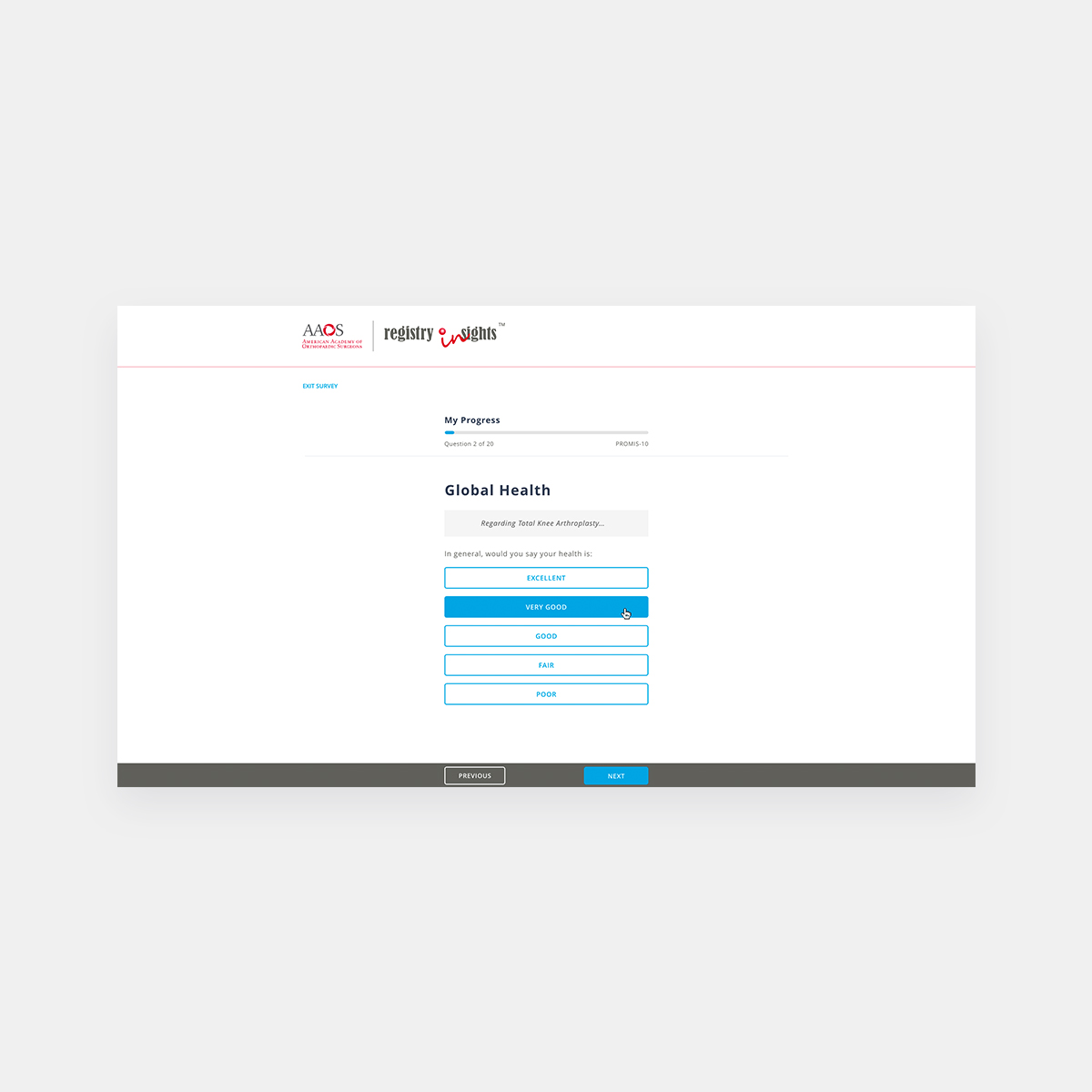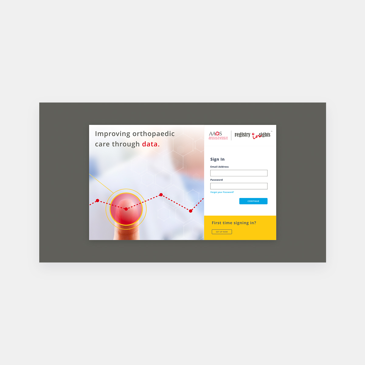 AAOS Registries are built on technology that allows your facility access to all of your AAOS-enrolled orthopaedic registries in one place. Subscribers can use the AAOS RegistryInsights® platform to run standard reports and use the dashboards to compare their institution to national benchmarks. In addition to procedural data dashboards, RegistryInsights offers a portal for the implementation and reporting of patient surveys. An added benefit is the ability to view issues with the files your institution uploaded, allowing for more accurate and relevant data in the Registry. And best of all, you can get access to your data within 48 hours of submission.